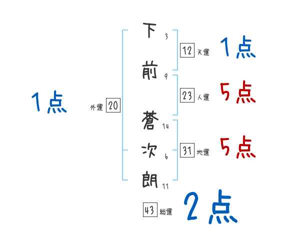 人運![]() | 下前蒼次朗さんの人運は23画の5つ星!想像力に優れ活力がある。一代で成功し名誉を手に入れる。 性格や才能などを表す2番目に重要な運勢です。人間関係や協調性、社会的な成功に影響します。主に20歳から50歳ぐらいまでの中年期の運勢を表します。 |