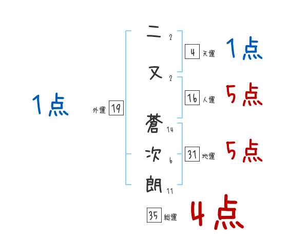 天運![]() | 二又蒼次朗さんの天運は4画の1つ星!感情が不安定で苦労するかも。周囲との協調を心掛けましょう。 家系が持つ宿命的な運勢を表します。祖先から受け継いだ苗字ですので自分の力が及びません。家柄を象徴します。 |