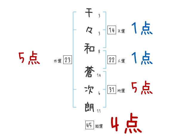 総運![]() | 千々和蒼次朗さんの総運は45画の4つ星!もくもくと物事を進め達成する。地味な努力家。 あなたの人生を表す1番重要な運勢です。生涯を通じて影響する総合運となり、主に50歳以降の晩年期に影響を及ぼします。 |