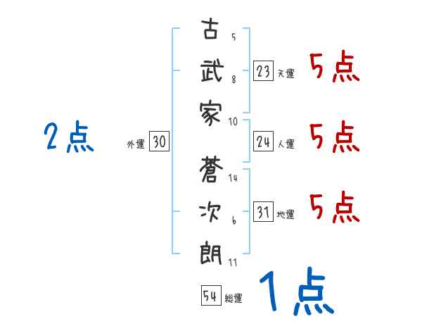 天運![]() | 古武家蒼次朗さんの天運は23画の5つ星!想像力に優れ活力がある。一代で成功し名誉を手に入れる。 家系が持つ宿命的な運勢を表します。祖先から受け継いだ苗字ですので自分の力が及びません。家柄を象徴します。 |