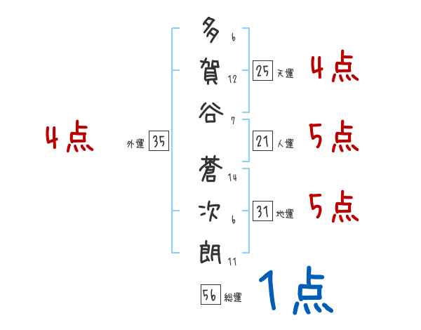総運![]() | 多賀谷蒼次朗さんの総運は56画の1つ星!消極的で無気力になりがち。誠実な気持ちが必要でしょう。 あなたの人生を表す1番重要な運勢です。生涯を通じて影響する総合運となり、主に50歳以降の晩年期に影響を及ぼします。 |