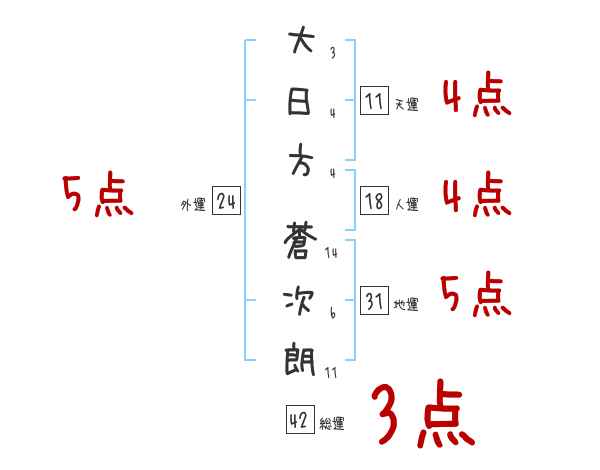 外運![]() | 大日方蒼次朗さんの外運は24画の5つ星!家庭運が良く順調な人生。金運にも恵まれる。 生活面を象徴する運勢です。外部から受ける影響力を表し、結婚運、家庭運や職場、環境への順応性を表します。 |