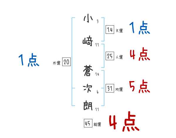 総運![]() | 小﨑蒼次朗さんの総運は45画の4つ星!もくもくと物事を進め達成する。地味な努力家。 あなたの人生を表す1番重要な運勢です。生涯を通じて影響する総合運となり、主に50歳以降の晩年期に影響を及ぼします。 |