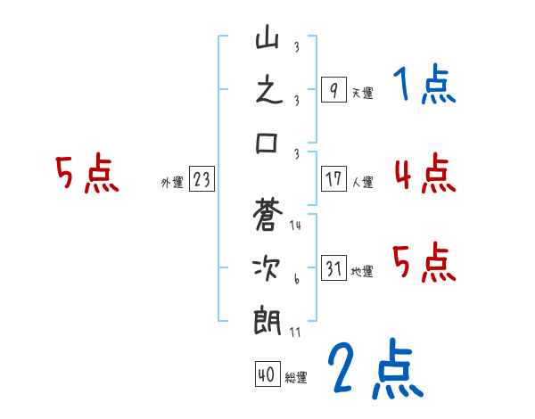 外運![]() | 山之口蒼次朗さんの外運は23画の5つ星!想像力に優れ活力がある。一代で成功し名誉を手に入れる。 生活面を象徴する運勢です。外部から受ける影響力を表し、結婚運、家庭運や職場、環境への順応性を表します。 |