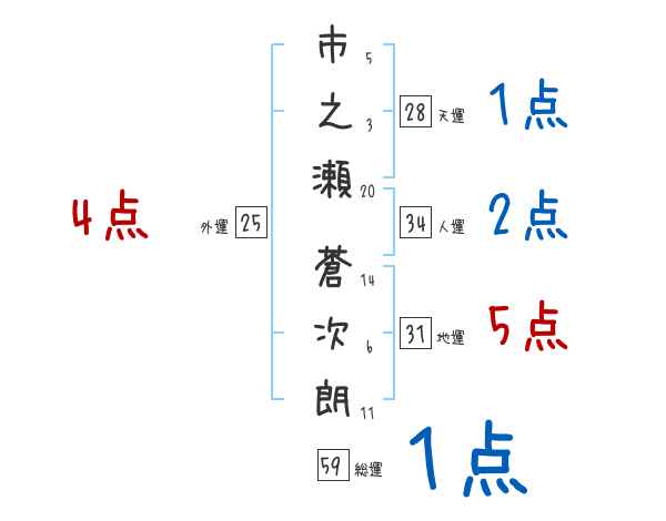 地運![]() | 市之瀬蒼次朗さんの地運は31画の5つ星!社交性があり判断力に優れる。順風満帆な人生で円満な生活。 個性を表す基礎的な運勢です。性格形成や対人関係、行動力など家庭環境に影響されます。主に誕生してから20歳くらいまでの若年期の運勢を表します。 |