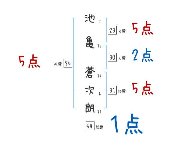 天運![]() | 池亀蒼次朗さんの天運は23画の5つ星!想像力に優れ活力がある。一代で成功し名誉を手に入れる。 家系が持つ宿命的な運勢を表します。祖先から受け継いだ苗字ですので自分の力が及びません。家柄を象徴します。 |
