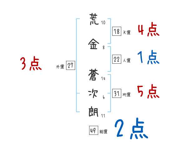天運![]() | 荒金蒼次朗さんの天運は18画の4つ星!情熱的で剛気。忍耐力があり信頼される。 家系が持つ宿命的な運勢を表します。祖先から受け継いだ苗字ですので自分の力が及びません。家柄を象徴します。 |