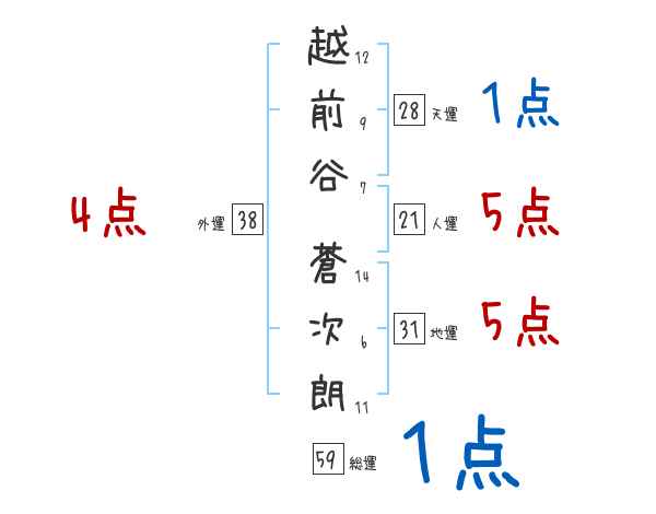 外運![]() | 越前谷蒼次朗さんの外運は38画の4つ星!温厚な性格で技術的な才能を発揮する。職人的な仕事に向いている。 生活面を象徴する運勢です。外部から受ける影響力を表し、結婚運、家庭運や職場、環境への順応性を表します。 |