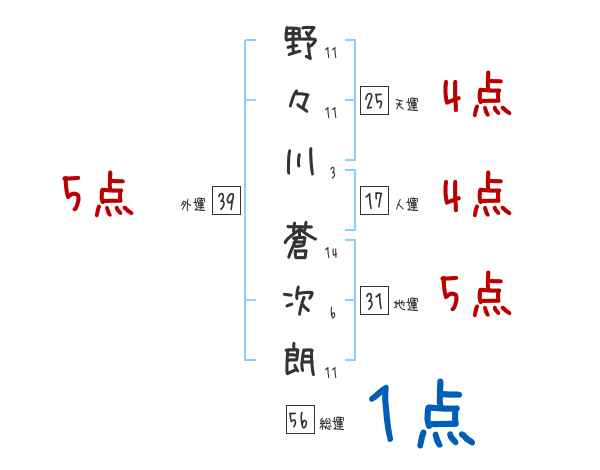 外運![]() | 野々川蒼次朗さんの外運は39画の5つ星!社交性に優れ人望が厚い。人の上に立ち成功する。 生活面を象徴する運勢です。外部から受ける影響力を表し、結婚運、家庭運や職場、環境への順応性を表します。 |