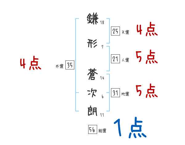 外運![]() | 鎌形蒼次朗さんの外運は35画の4つ星!温厚な性格で感受性が高い。穏和な性格で人望が厚い。 生活面を象徴する運勢です。外部から受ける影響力を表し、結婚運、家庭運や職場、環境への順応性を表します。 |