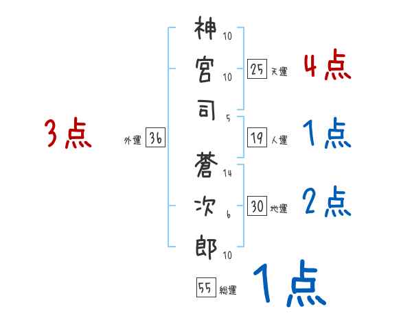外運![]() | 神宮司蒼次郎さんの外運は36画の3つ星!先見性が豊かです。多少神経質で苦労することも。 生活面を象徴する運勢です。外部から受ける影響力を表し、結婚運、家庭運や職場、環境への順応性を表します。 |