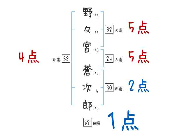 天運![]() | 野々宮蒼次郎さんの天運は32画の5つ星!柔軟性があり成功する。チャンスが多く金運が良い。 家系が持つ宿命的な運勢を表します。祖先から受け継いだ苗字ですので自分の力が及びません。家柄を象徴します。 |