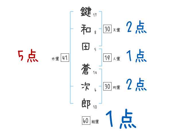 天運![]() | 鍵和田蒼次郎さんの天運は30画の2つ星!浮き沈みの激しさに注意しましょう。 家系が持つ宿命的な運勢を表します。祖先から受け継いだ苗字ですので自分の力が及びません。家柄を象徴します。 |