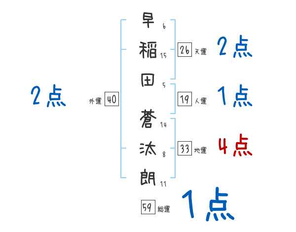 天運![]() | 早稲田蒼汰朗さんの天運は26画の2つ星!波瀾万丈かも。信頼できる人を大事にしましょう。 家系が持つ宿命的な運勢を表します。祖先から受け継いだ苗字ですので自分の力が及びません。家柄を象徴します。 |