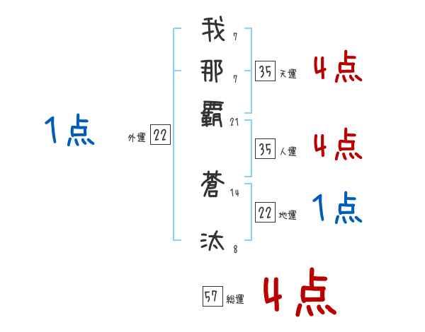 人運![]() | 我那覇蒼汰さんの人運は35画の4つ星!温厚な性格で感受性が高い。穏和な性格で人望が厚い。 性格や才能などを表す2番目に重要な運勢です。人間関係や協調性、社会的な成功に影響します。主に20歳から50歳ぐらいまでの中年期の運勢を表します。 |