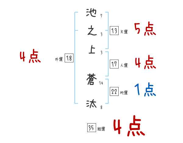 外運![]() | 池之上蒼汰さんの外運は18画の4つ星!情熱的で剛気。忍耐力があり信頼される。 生活面を象徴する運勢です。外部から受ける影響力を表し、結婚運、家庭運や職場、環境への順応性を表します。 |