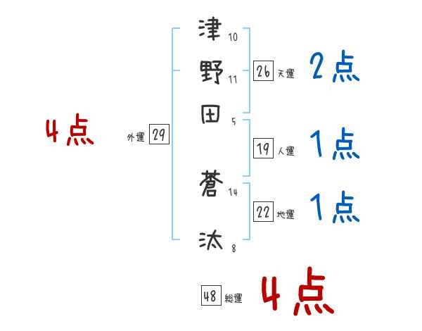 総運![]() | 津野田蒼汰さんの総運は48画の4つ星!賢明な性格で人望が厚い。指導力があり多くの人に尊敬される。 あなたの人生を表す1番重要な運勢です。生涯を通じて影響する総合運となり、主に50歳以降の晩年期に影響を及ぼします。 |
