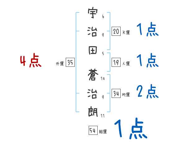 外運![]() | 宇治田蒼治朗さんの外運は35画の4つ星!温厚な性格で感受性が高い。穏和な性格で人望が厚い。 生活面を象徴する運勢です。外部から受ける影響力を表し、結婚運、家庭運や職場、環境への順応性を表します。 |