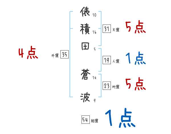 外運![]() | 俵積田蒼波さんの外運は35画の4つ星!温厚な性格で感受性が高い。穏和な性格で人望が厚い。 生活面を象徴する運勢です。外部から受ける影響力を表し、結婚運、家庭運や職場、環境への順応性を表します。 |