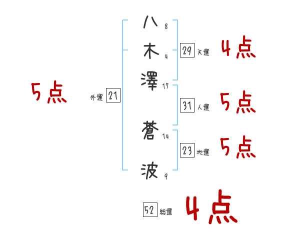 総運![]() | 八木澤蒼波さんの総運は52画の4つ星!先見性と独創性に優れ考える力がある。強運の持ち主。 あなたの人生を表す1番重要な運勢です。生涯を通じて影響する総合運となり、主に50歳以降の晩年期に影響を及ぼします。 |