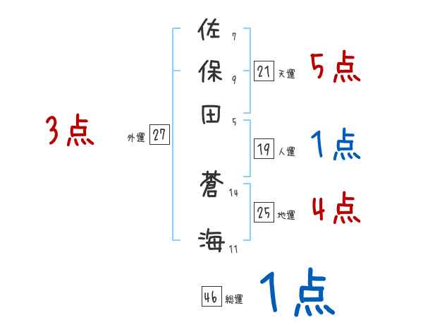 天運![]() | 佐保田蒼海さんの天運は21画の5つ星!統率力がある。独立し成功する。名誉を手に入れる。 家系が持つ宿命的な運勢を表します。祖先から受け継いだ苗字ですので自分の力が及びません。家柄を象徴します。 |