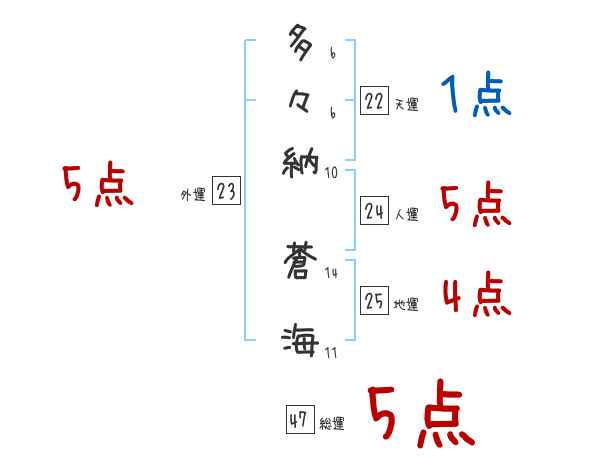 総運![]() | 多々納蒼海さんの総運は47画の5つ星!実力が開花し発展する円満な人生。財に恵まれる。 あなたの人生を表す1番重要な運勢です。生涯を通じて影響する総合運となり、主に50歳以降の晩年期に影響を及ぼします。 |