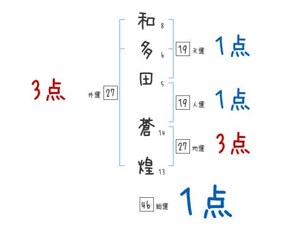 総運![]() | 和多田蒼煌さんの総運は46画の1つ星!迷走することが多く苦労するかも。目先のことにとらわれないように。 あなたの人生を表す1番重要な運勢です。生涯を通じて影響する総合運となり、主に50歳以降の晩年期に影響を及ぼします。 |
