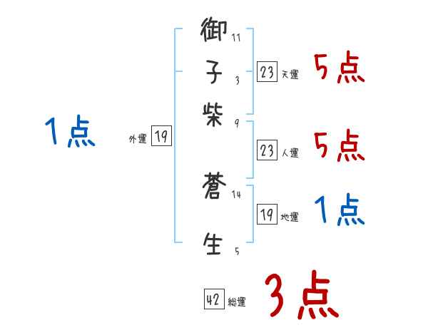 天運![]() | 御子柴蒼生さんの天運は23画の5つ星!想像力に優れ活力がある。一代で成功し名誉を手に入れる。 家系が持つ宿命的な運勢を表します。祖先から受け継いだ苗字ですので自分の力が及びません。家柄を象徴します。 |