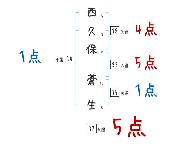 人運![]() | 西久保蒼生さんの人運は23画の5つ星!想像力に優れ活力がある。一代で成功し名誉を手に入れる。 性格や才能などを表す2番目に重要な運勢です。人間関係や協調性、社会的な成功に影響します。主に20歳から50歳ぐらいまでの中年期の運勢を表します。 |