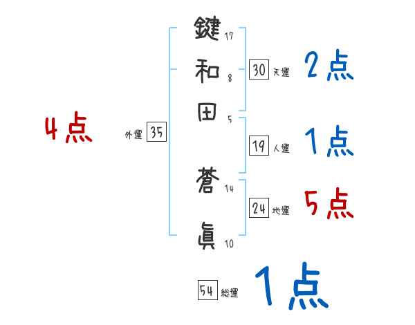外運![]() | 鍵和田蒼眞さんの外運は35画の4つ星!温厚な性格で感受性が高い。穏和な性格で人望が厚い。 生活面を象徴する運勢です。外部から受ける影響力を表し、結婚運、家庭運や職場、環境への順応性を表します。 |
