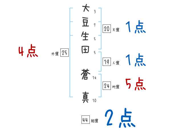 総運![]() | 大豆生田蒼真さんの総運は44画の2つ星!誠実で慎重な性格。物事を考えすぎないように注意しましょう。 あなたの人生を表す1番重要な運勢です。生涯を通じて影響する総合運となり、主に50歳以降の晩年期に影響を及ぼします。 |