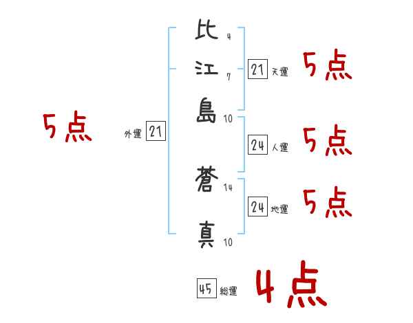 天運![]() | 比江島蒼真さんの天運は21画の5つ星!統率力がある。独立し成功する。名誉を手に入れる。 家系が持つ宿命的な運勢を表します。祖先から受け継いだ苗字ですので自分の力が及びません。家柄を象徴します。 |