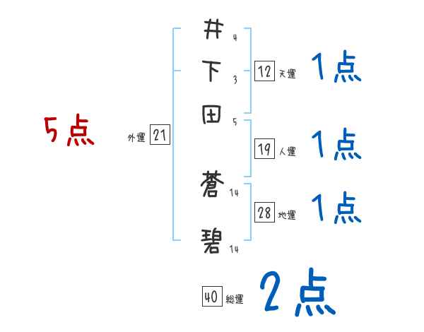 天運![]() | 井下田蒼碧さんの天運は12画の1つ星!簡単な失敗で諦めてしまいやすいかも。着実に行動すると良いでしょう。 家系が持つ宿命的な運勢を表します。祖先から受け継いだ苗字ですので自分の力が及びません。家柄を象徴します。 |