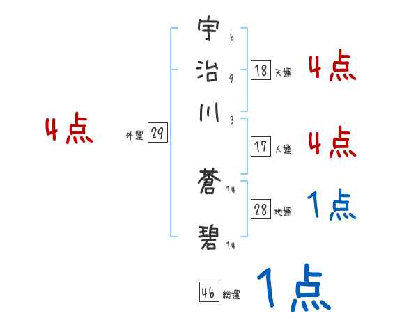 天運![]() | 宇治川蒼碧さんの天運は18画の4つ星!情熱的で剛気。忍耐力があり信頼される。 家系が持つ宿命的な運勢を表します。祖先から受け継いだ苗字ですので自分の力が及びません。家柄を象徴します。 |