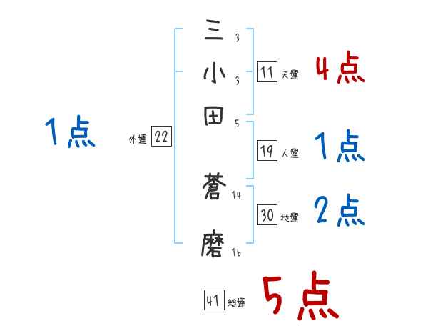 天運![]() | 三小田蒼磨さんの天運は11画の4つ星!着実に富や地位を得る幸運な人生。 家系が持つ宿命的な運勢を表します。祖先から受け継いだ苗字ですので自分の力が及びません。家柄を象徴します。 |