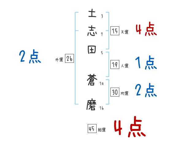 総運![]() | 土志田蒼磨さんの総運は45画の4つ星!もくもくと物事を進め達成する。地味な努力家。 あなたの人生を表す1番重要な運勢です。生涯を通じて影響する総合運となり、主に50歳以降の晩年期に影響を及ぼします。 |