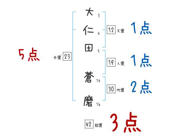 天運![]() | 大仁田蒼磨さんの天運は12画の1つ星!簡単な失敗で諦めてしまいやすいかも。着実に行動すると良いでしょう。 家系が持つ宿命的な運勢を表します。祖先から受け継いだ苗字ですので自分の力が及びません。家柄を象徴します。 |