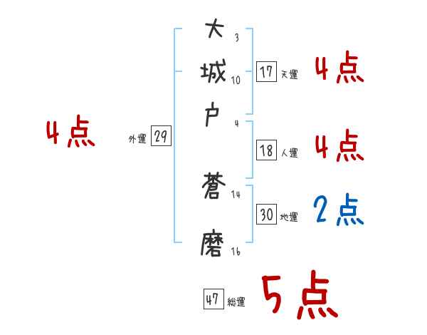 総運![]() | 大城戸蒼磨さんの総運は47画の5つ星!実力が開花し発展する円満な人生。財に恵まれる。 あなたの人生を表す1番重要な運勢です。生涯を通じて影響する総合運となり、主に50歳以降の晩年期に影響を及ぼします。 |