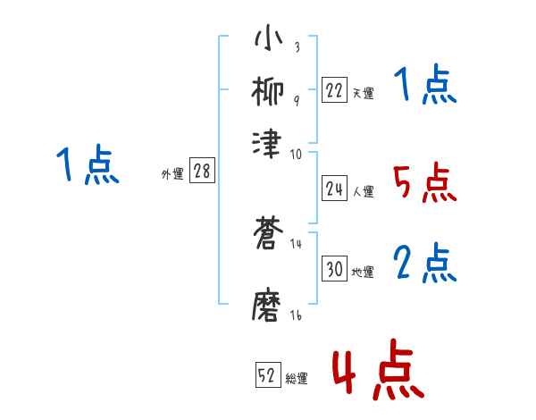 総運![]() | 小柳津蒼磨さんの総運は52画の4つ星!先見性と独創性に優れ考える力がある。強運の持ち主。 あなたの人生を表す1番重要な運勢です。生涯を通じて影響する総合運となり、主に50歳以降の晩年期に影響を及ぼします。 |