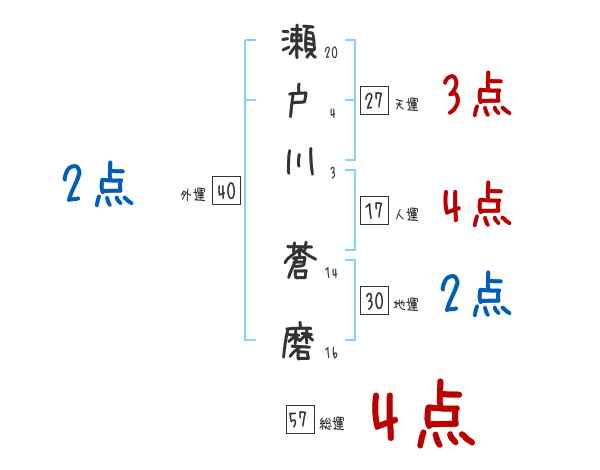 総運![]() | 瀬戸川蒼磨さんの総運は57画の4つ星!向上心があり人望がある。地位を得る。 あなたの人生を表す1番重要な運勢です。生涯を通じて影響する総合運となり、主に50歳以降の晩年期に影響を及ぼします。 |
