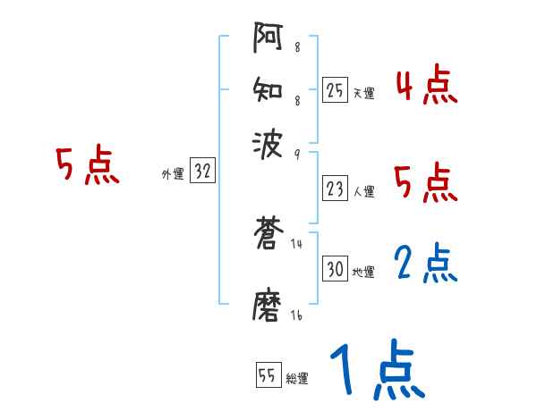 外運![]() | 阿知波蒼磨さんの外運は32画の5つ星!柔軟性があり成功する。チャンスが多く金運が良い。 生活面を象徴する運勢です。外部から受ける影響力を表し、結婚運、家庭運や職場、環境への順応性を表します。 |