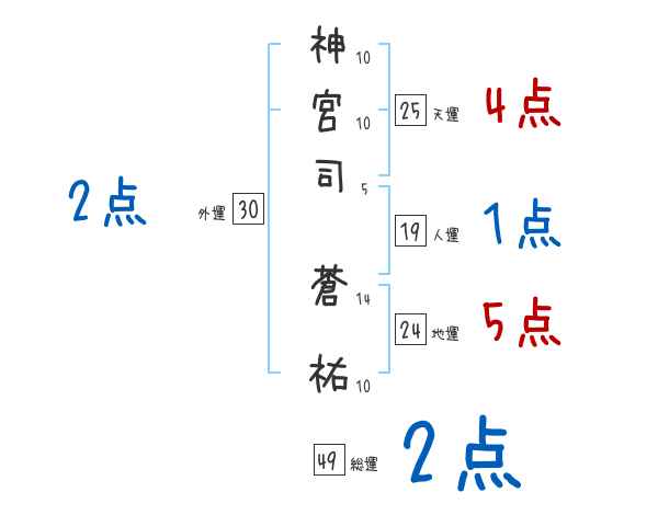 天運![]() | 神宮司蒼祐さんの天運は25画の4つ星!個性があり才能があふれる。強運の持ち主で発展する。 家系が持つ宿命的な運勢を表します。祖先から受け継いだ苗字ですので自分の力が及びません。家柄を象徴します。 |