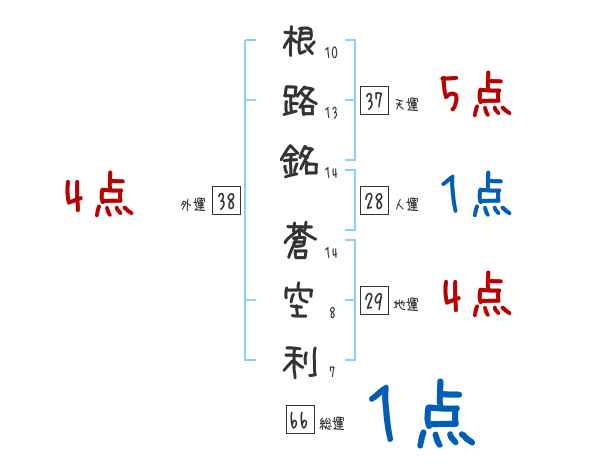 外運![]() | 根路銘蒼空利さんの外運は38画の4つ星!温厚な性格で技術的な才能を発揮する。職人的な仕事に向いている。 生活面を象徴する運勢です。外部から受ける影響力を表し、結婚運、家庭運や職場、環境への順応性を表します。 |