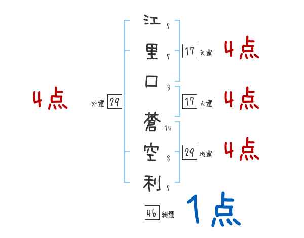 外運![]() | 江里口蒼空利さんの外運は29画の4つ星!完全主義で才能がある。厳格な心の持ち主。 生活面を象徴する運勢です。外部から受ける影響力を表し、結婚運、家庭運や職場、環境への順応性を表します。 |