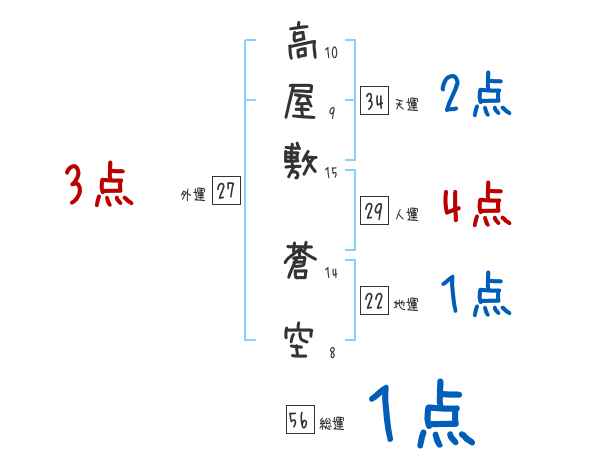 総運![]() | 高屋敷蒼空さんの総運は56画の1つ星!消極的で無気力になりがち。誠実な気持ちが必要でしょう。 あなたの人生を表す1番重要な運勢です。生涯を通じて影響する総合運となり、主に50歳以降の晩年期に影響を及ぼします。 |