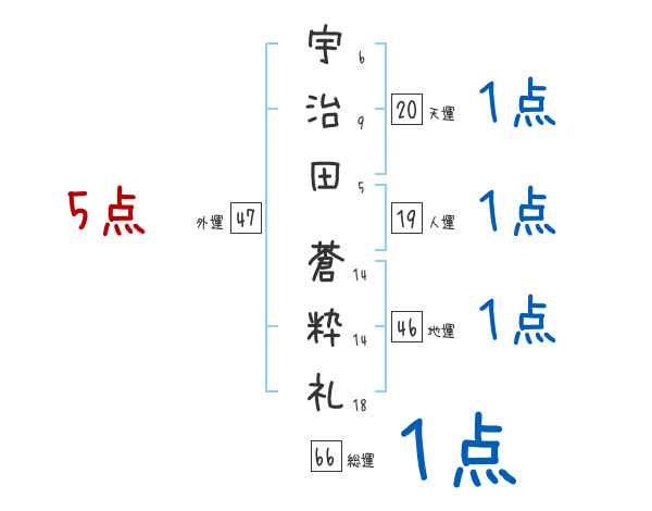 外運![]() | 宇治田蒼粋礼さんの外運は47画の5つ星!実力が開花し発展する円満な人生。財に恵まれる。 生活面を象徴する運勢です。外部から受ける影響力を表し、結婚運、家庭運や職場、環境への順応性を表します。 |