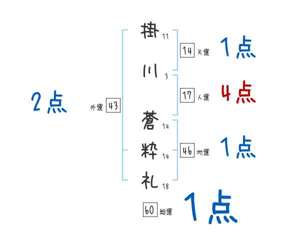 天運![]() | 掛川蒼粋礼さんの天運は14画の1つ星!人に対して優しいがストレスを溜め込みがち。人間関係のトラブルを避けるよう気をつけましょう。 家系が持つ宿命的な運勢を表します。祖先から受け継いだ苗字ですので自分の力が及びません。家柄を象徴します。 |