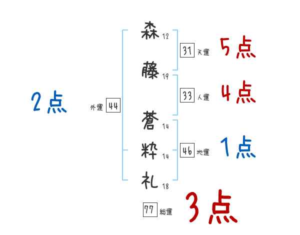 天運![]() | 森藤蒼粋礼さんの天運は31画の5つ星!社交性があり判断力に優れる。順風満帆な人生で円満な生活。 家系が持つ宿命的な運勢を表します。祖先から受け継いだ苗字ですので自分の力が及びません。家柄を象徴します。 |