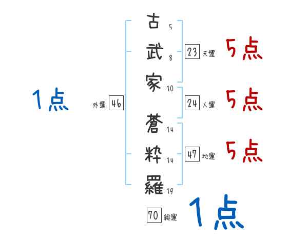 天運![]() | 古武家蒼粋羅さんの天運は23画の5つ星!想像力に優れ活力がある。一代で成功し名誉を手に入れる。 家系が持つ宿命的な運勢を表します。祖先から受け継いだ苗字ですので自分の力が及びません。家柄を象徴します。 |