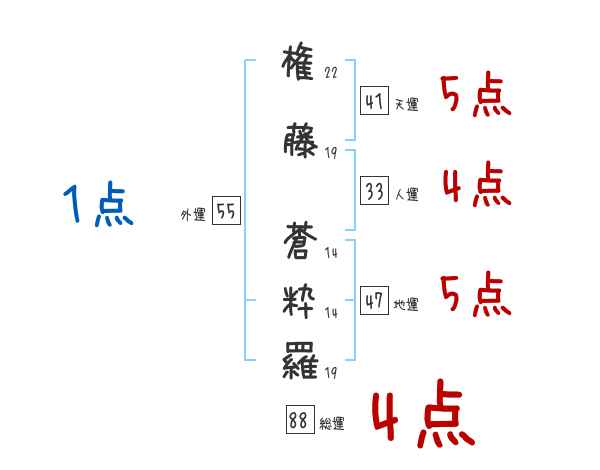 天運![]() | 権藤蒼粋羅さんの天運は41画の5つ星!大志を抱き、目標に向かって実力を発揮し達成する。温和な性格。 家系が持つ宿命的な運勢を表します。祖先から受け継いだ苗字ですので自分の力が及びません。家柄を象徴します。 |